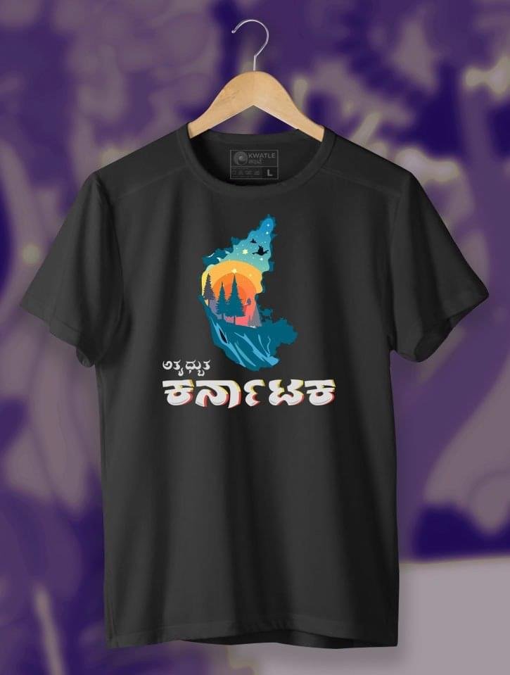 Atyadbhuta Karnataka” Kannada T-shirts showcases the diverse wildlife and rich landscape heritage of Karnataka, capturing its natural beauty and cultural essence in a striking design.